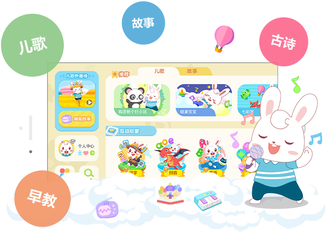 集合了兔小贝一系列的儿歌、故事、古诗、早教学习等动画视频。兔小贝系列视频已在各大视频平台播放百亿次。
